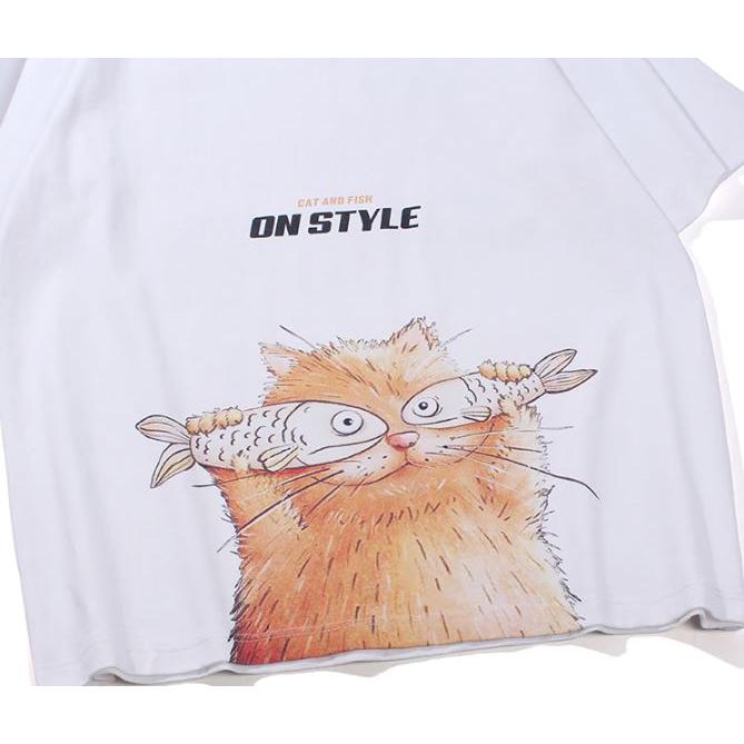 3色】魚で目を隠す猫のイラストがかわいいおもしろTシャツ バック - 猫 チャ ンピオン 基準
